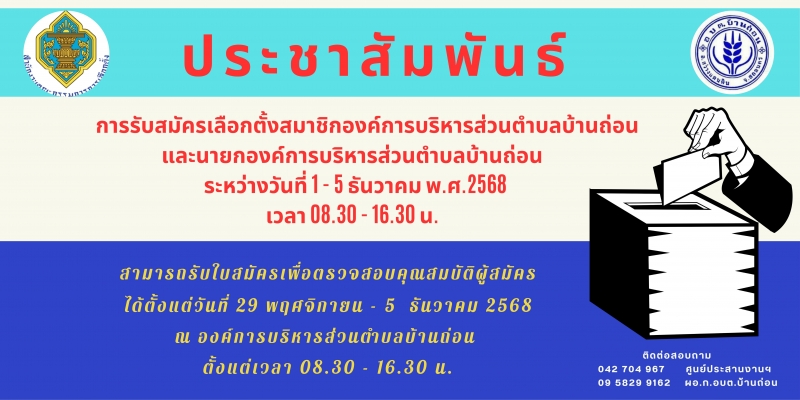 ประชาสัมพันธ์การรับสมัครเลือกตั้งสมาชิกสภาองค์การบริหารส่วนตำบล และนายกองค์การบริหารส่วนตำบลบ้านถ่อน...