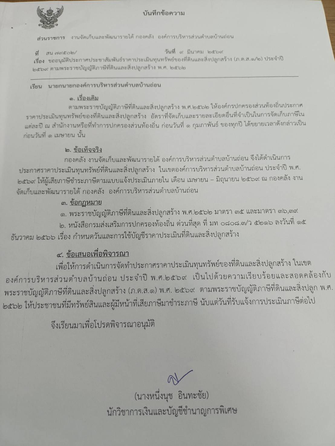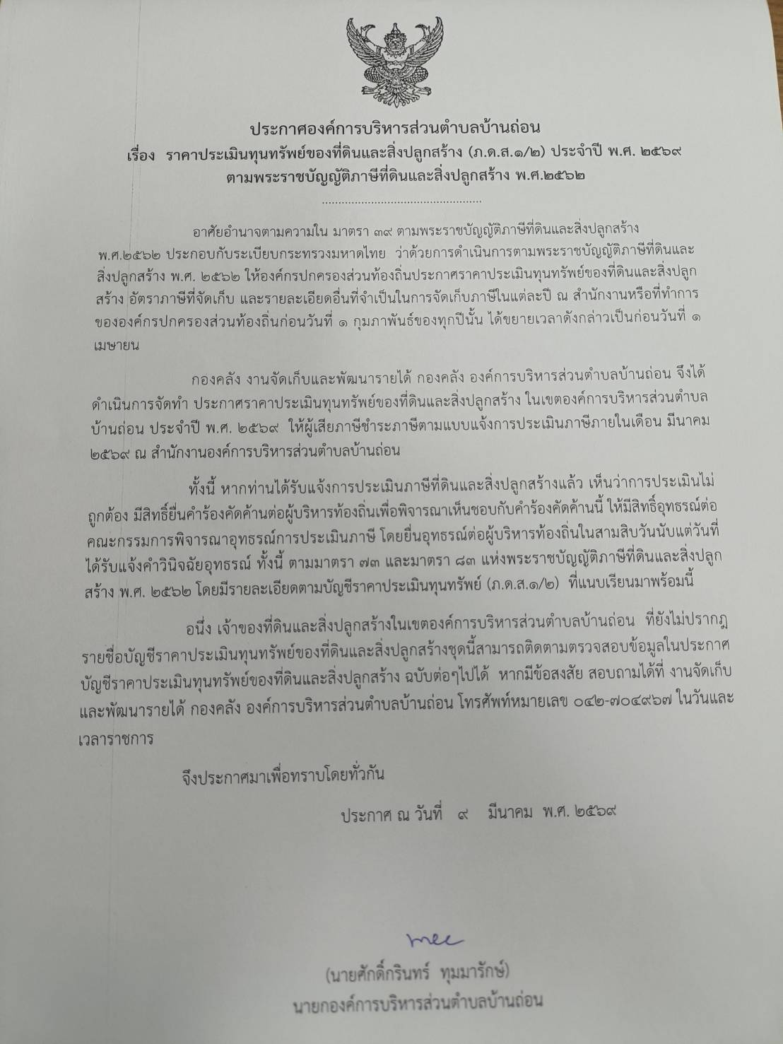 ประกาศราคาประเมินทุนทรัพย์ของที่ดินและสิ่งปลูกสร้าง (ภ.ด.ส.1/2)ประจำปี พ.ศ. 2569
